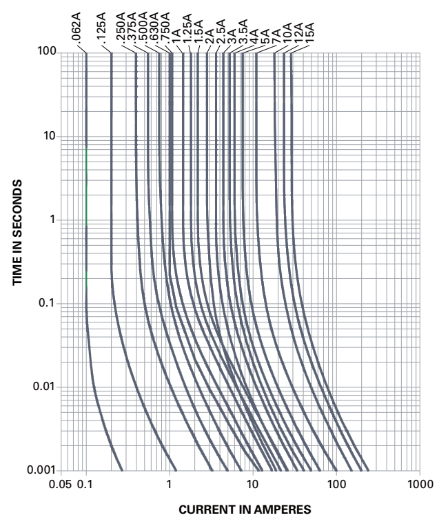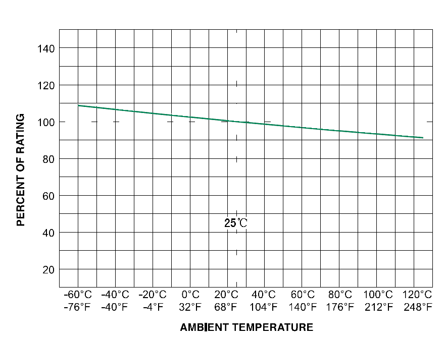 Notes: 1. Derating depicted in this curve is in addition to the standard derating of 20% for continuous operation. Example:For continuous operation at 75 degrees celsius, the fuse should be derated as follows:I = (0.80)(0.85)IRAT= (0.68)IRAT